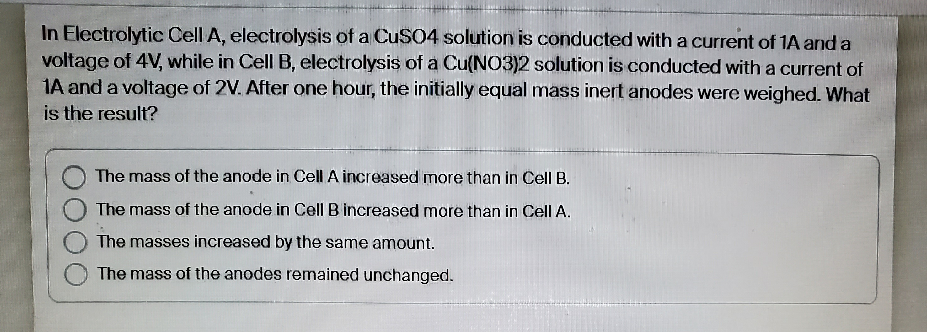 In Electrolytic Cell A, electrolysis of a CuSO4 solution is conducted with a current of 1A and a voltage of 4 V , while in Cell B, electrolysis of a Cu(NO3)2 solution is conducted with a current of 1 A and a voltage of 2 V . After one hour, the initially equal mass inert anodes were weighed. What is the result?The mass of the anode in Cell A increased more than in Cell B.The mass of the anode in Cell B increased more than in Cell A.The masses increased by the same amount.The mass of the anodes remained unchanged.