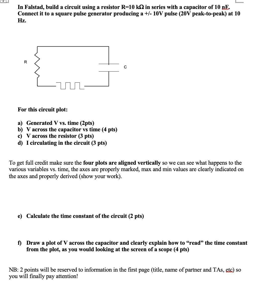 In Falstad, build a circuit using a resistor R=10kOmega in series with a capacitor of 10 nE . Connect it to a square pulse generator producing a +//-10V pulse ( 20 V peak-to-peak) at 10 Hz. For this circuit plot: a) Generated V vs. time (2pts) b) V across the capacitor vs time ( 4pts ) c) V across the resistor ( 3pts ) d) I circulating in the circuit ( 3pts ) To get full credit make sure the four plots are aligned vertically so we can see what happens to the various variables vs. time, the axes are properly marked, max and min values are clearly indicated on the axes and properly derived (show your work). e) Calculate the time constant of the circuit ( 2pts ) f) Draw a plot of V across the capacitor and clearly explain how to "read" the time constant from the plot, as you would looking at the screen of a scope (4 pts) NB: 2 points will be reserved to information in the first page (title, name of partner and TAs, etc)