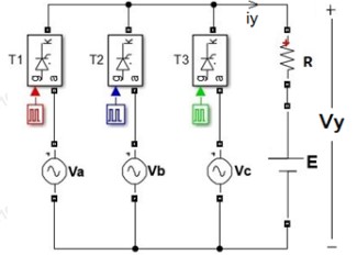 In the adjacent circuit fed from our low voltage network, thyristors with E=180V and R=2 Ohm are triggered with alpha=35 degrees.
