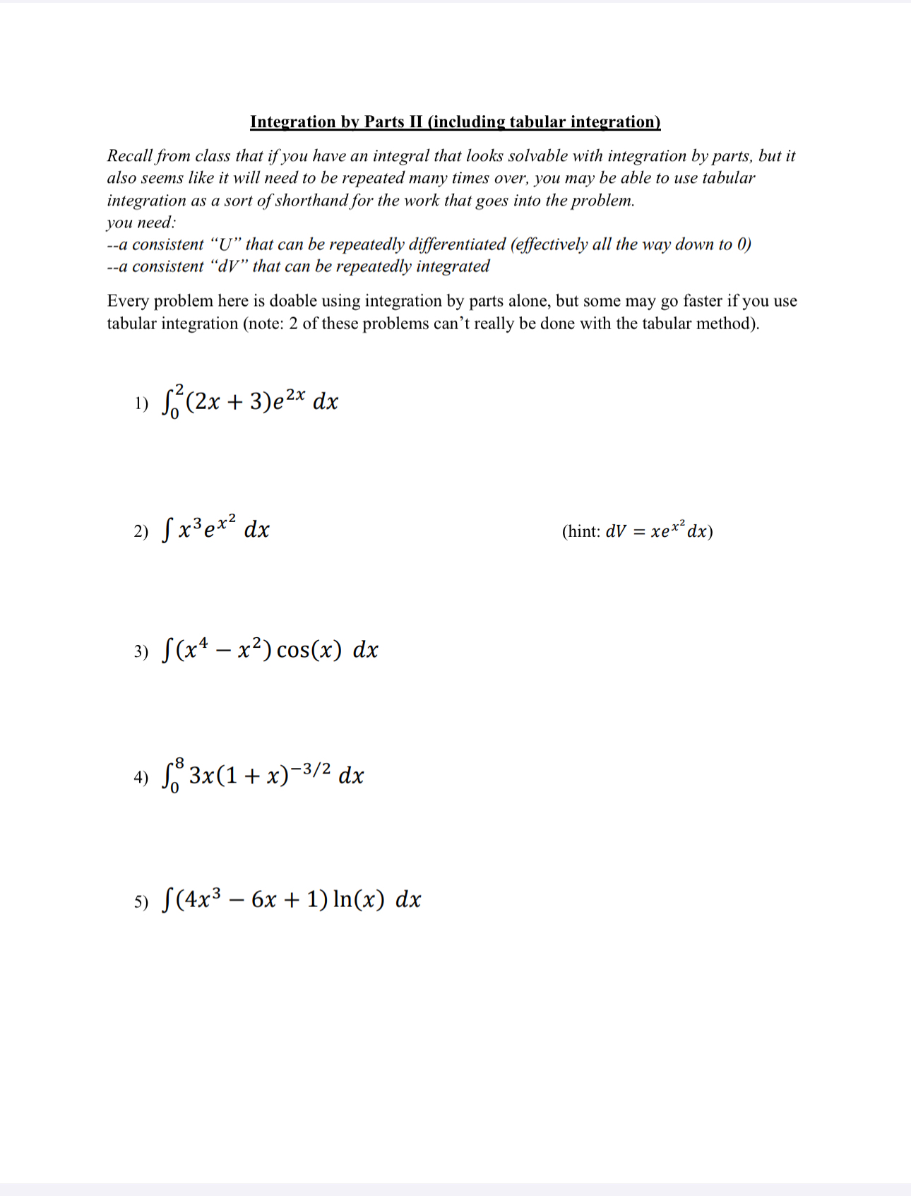 dV" that can be repeatedly integrated Every problem here is doable using integration by parts alone, but some may go faster if you use tabular integration (note: 2 of these problems can't really be done with the tabular method).