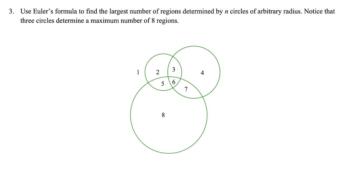 ncircles of arbitrary radius. Notice that three circles determine a maximum number of 8 regions. that a convex pentagon is partitioned by its diagonals into 11 regions.