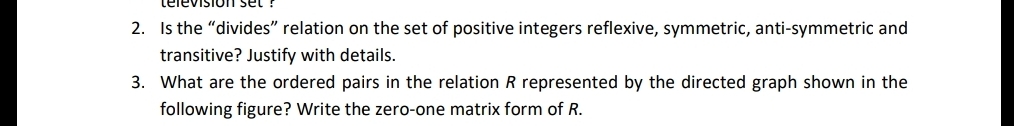Is the "divides" relation on the set of positive integers reflexive, symmetric, anti-symmetric and transitive? Justify with details. What are the ordered pairs in the relation