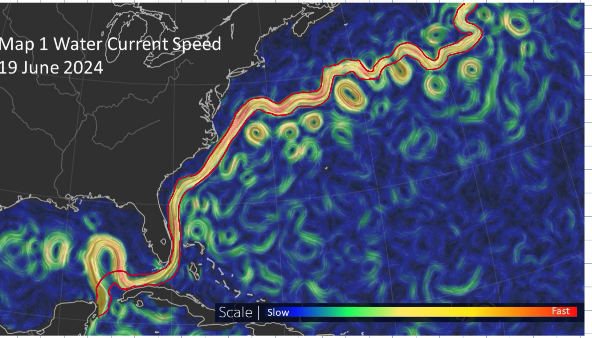 Is this a correct drawing of the banks or edges of the gulf stream?Map 1 Water Current Speced 19 June 2024