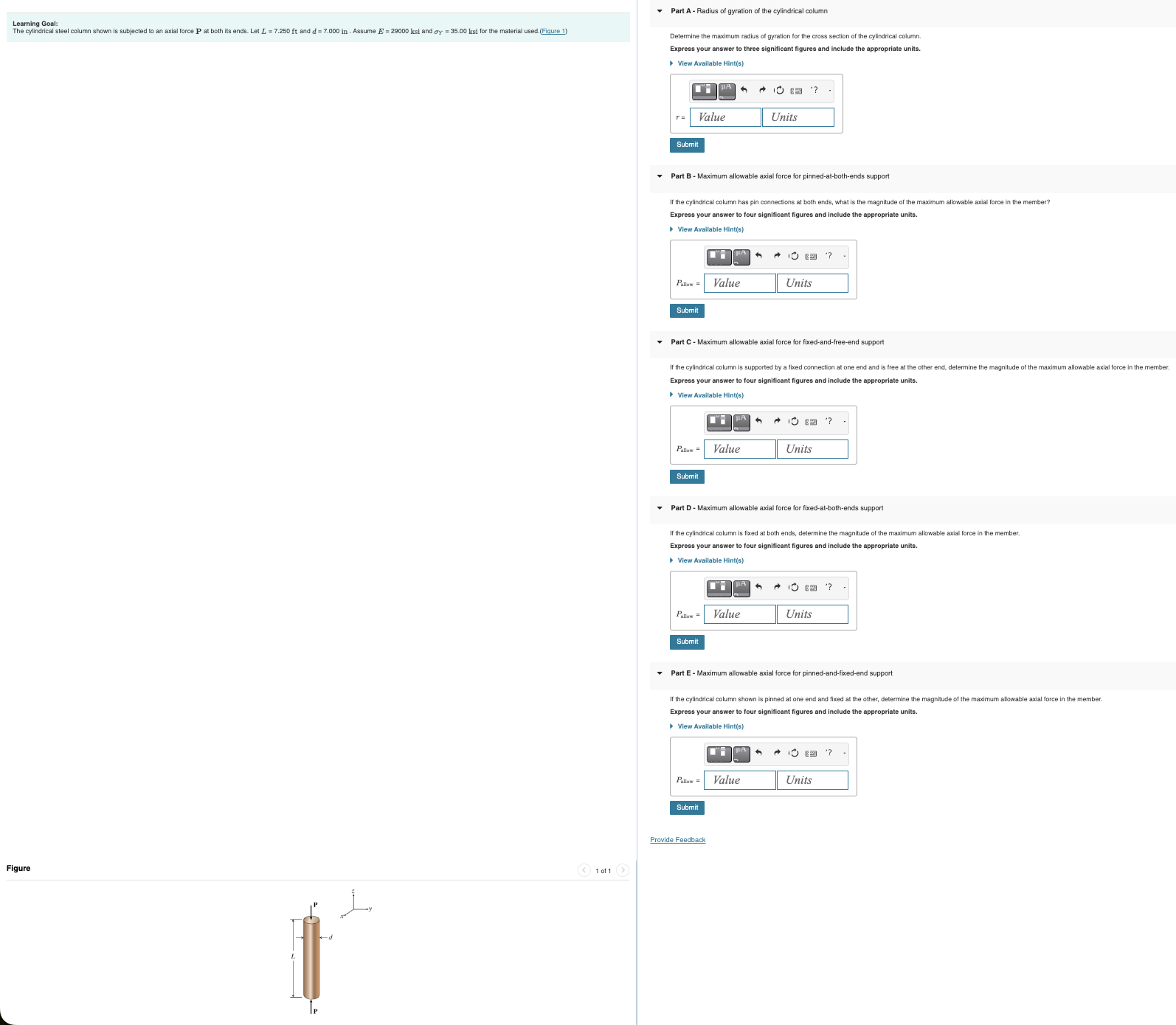 \sigma _(Y)=35.00ksifor the material used.(Figure 1 ) Part A - Radius of gyration of the cylindrical column Determine the maximum radius of gyration for the cross section of the cylindrical column. Express your answer to three significant figures and include the appropriate units. View Available Hint(s) Units Part B - Maximum allowable axial force for pinned-at-both-ends support If the cylindrical column has pin connections at both ends, what is the magnitude of the maximum allowable axial force in the member? Express your answer to four significant figures and include the appropriate units. View Available Hint(s) Part C - Maximum allowable axial force for fixed-and-free-end support If the cylindrical column is supported by a fixed connection at one end and is tree at the other end, determine the magnitude of the maximum allowable axial force in the member. Express your answer to four significant figures and include the appropriate units. V View Available Hint(s)