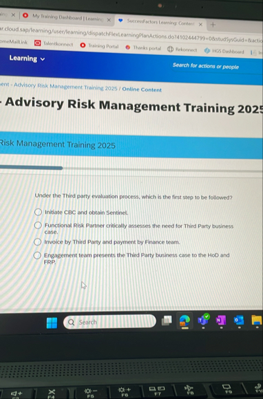Learning Search for actions or people ent - Advisory Risk Management Training 2025 / Online Content Advisory Risk Management Training 2025 Risk Management Training 2025 Under the Third party evaluation process, which is the first step to be followed?