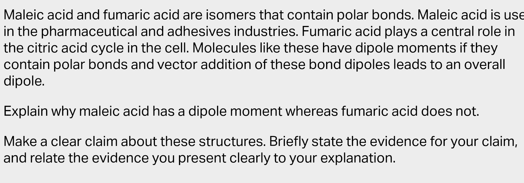 Maleic acid and fumaric acid are isomers that contain polar bonds. Maleic acid is use in the pharmaceutical and adhesives industries. Fumaric acid plays a central role in the citric acid cycle in the cell. Molecules like these have dipole moments if they contain polar bonds and vector addition of these bond dipoles leads to an overall dipole. Explain why maleic acid has a dipole moment whereas fumaric acid does not. Make a clear claim about these structures. Briefly state the evidence for your claim, and relate the evidence you present clearly to your explanation.