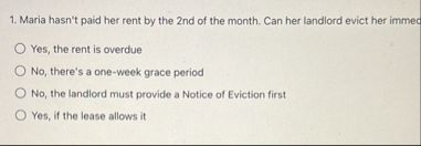Maria hasn't paid her rent by the 2nd of the month. Can her landlord evict her immed