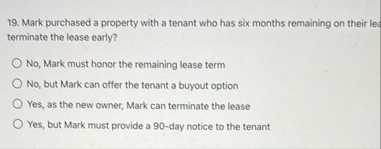 Mark purchased a property with a tenant who has six months remaining on their lea terminate the lease early?