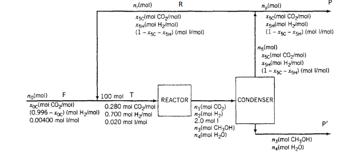 Methanol is produced in the reaction of carbon dioxide and hydrogen: CO2+3H2→CH3OH+H2O The fresh feed to the process contains hydrogen, carbon dioxide, and 0.400mole% inerts (I). The reactor effluent passes to a condenser that removes essentially all of the methanol and water formed and none of the reactants or inerts. The latter substances are recycled to the reactor. To avoid buildup of the inerts in the system, a purge stream is withdrawn from the recycle. The feed to the reactor (not the fresh feed to the process) contains 28.0 mole %CO2, 70.0 mole %H2, and 2.00 mole % inerts. The single-pass conversion of hydrogen is 60.0%. Calculate the molar flow rates and molar compositions of the fresh feed, the total feed to the reactor, the recycle stream, and the purge stream for a methanol production rate of 155kmolCH3OH/h.