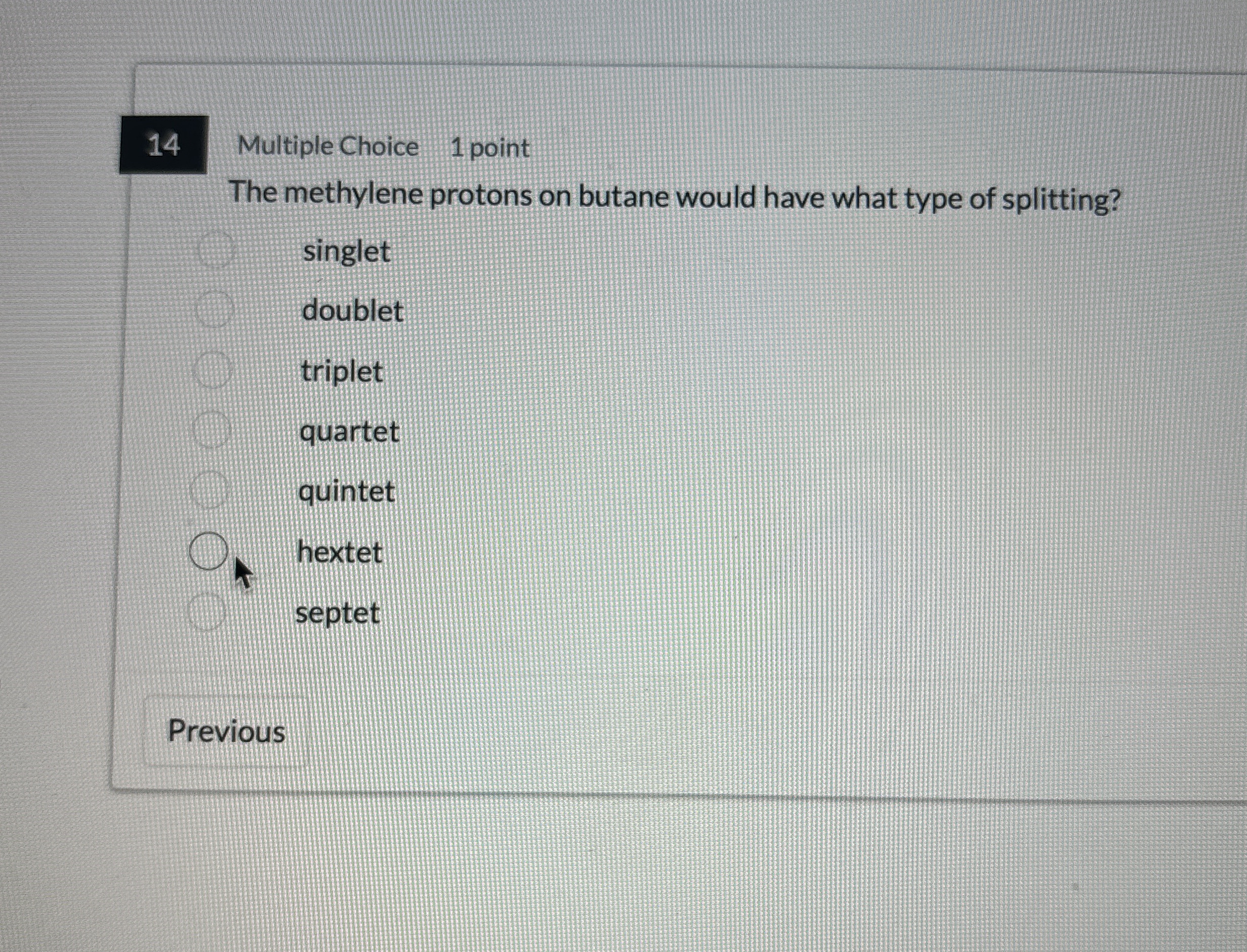 Multiple Choice 1 point The methylene protons on butane would have what type of splitting? singlet doublet triplet quartet quintet hextet septet