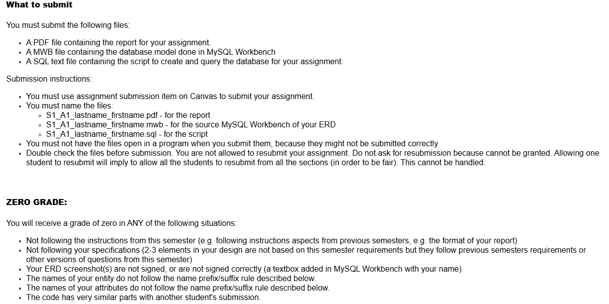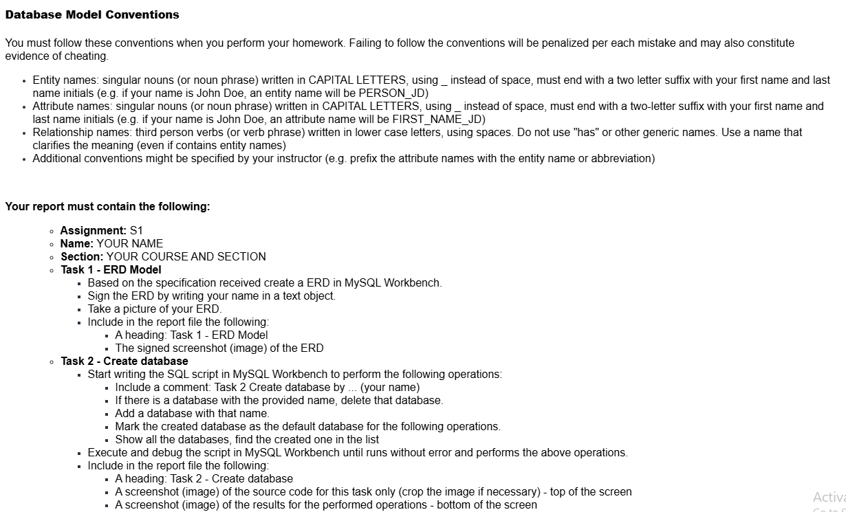 NEED HELP ASAP Your report must contain the following: - Assignment: S1 Name: YOUR NAME Section: YOUR COURSE AND SECTION Task 1 - ERD Model - Based on the specification received create a ERD in MySQL Workbench. - Sign the ERD by writing your name in a text object. - Take a picture of your ERD. - Include in the report file the following: - A heading: Task 1 - ERD Model - The signed screenshot (image) of the ERD - Task 2 - Create database - Start writing the SQL script in MySQL Workbench to perform the following operations: - Include a comment: Task 2 Create database by ... (your name) - If there is a database with the provided name, delete that database. - Add a database with that name. - Mark the created database as the default database for the following operations. - Show all the databases, find the created one in the list - Execute and debug the script in MySQL Workbench until runs without error and performs the above operations. - Include in the report file the following: - A heading: Task 2 - Create database - A screenshot (image) of the source code for this task only (crop the image if necessary) - top of the screen - A screenshot (image) of the results for the performed operations - bottom of the screen Task 3 - Create table ZERO GRADE: You will receive a grade of zero in ANY of the following situations: Not following the instructions from this semester (e.g. following instructions aspects from previous semesters, e.g. the format of your report) Not following your specifications (2-3 elements in your design are not based on this semester requirements but they follow previous semesters requirements or other versions of questions from this semester) Your ERD screenshot(s) are not signed, or are not signed correctly (a textbox added in MySQL Workbench with your name) The names of your entity do not follow the name prefix/suffix rule described below. The names of your attributes do not follow the name prefix/suffix rule described below. The code has very similar parts with another student's submission. Database Specification (this is a fictional scenario) You were contacted by a company named "Happy Time" to create a database with their employees. For an employee you will store the following information: A code (three characters) The first name (a text of up to 18 characters) The middle name (a text of up to 18 characters) The last name (a text of up to 18 characters) The phone number (a text with the pattern "(999) 999-9999") All the employees must have a code, first name, last name and phone number. Create a database, named HR , with a single table following the provided specification. First example of an employee is: Code: 235 First Name: Joe Middle Name: Peter Last Name: Doe Phone: (981) 884-6814 Second example of an employee is: Code: 239 First Name: Mary Last Name: Doe Phone: (981) 083-8913 Ask the following queries: The list of employees last name, first name and phone number. The list of employees with the first name "Joe".