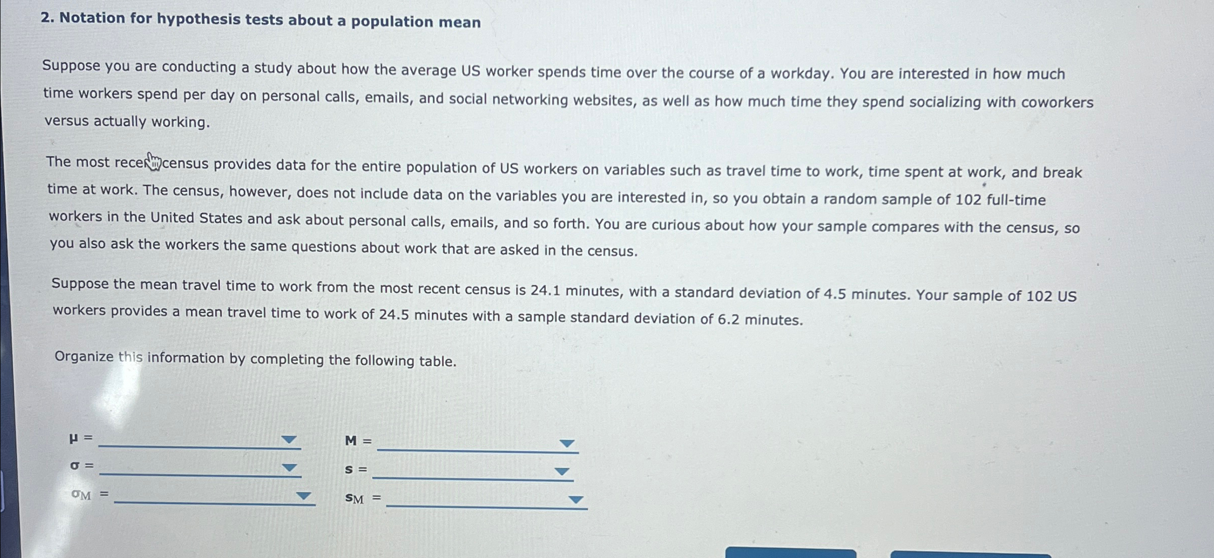 mmimensus provides data for the entire population of US workers on variables such as travel time to work, time spent at work, and break time at work. The census, however, does not include data on the variables you are interested in, so you obtain a random sample of 102 full-time workers in the United States and ask about personal calls, emails, and so forth. You are curious about how your sample compares with the census, so you also ask the workers the same questions about work that are asked in the census. Suppose the mean travel time to work from the most recent census is 24.1 minutes, with a standard deviation of 4.5 minutes. Your sample of 102 US workers provides a mean travel time to work of 24.5 minutes with a sample standard deviation of 6.2 minutes. Organize this information by completing the following table.