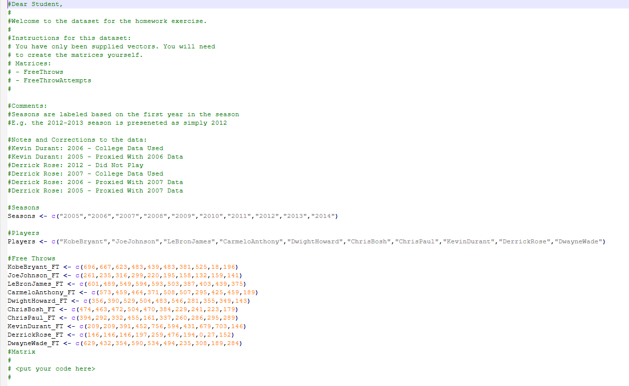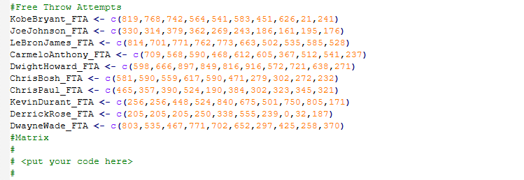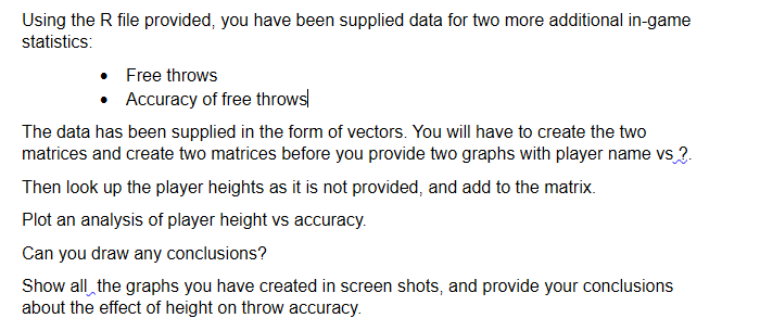 Using the R file provided, you have been supplied data for two more additional in-game statistics: - Free throws - Accuracy of free throws| The data has been supplied in the form of vectors. You will have to create the two matrices and create two matrices before you provide two graphs with player name vs?. Then look up the player heights as it is not provided, and add to the matrix. Plot an analysis of player height vs accuracy. Can you draw any conclusions? Show all the graphs you have created in screen shots, and provide your conclusions about the effect of height on throw accuracy.