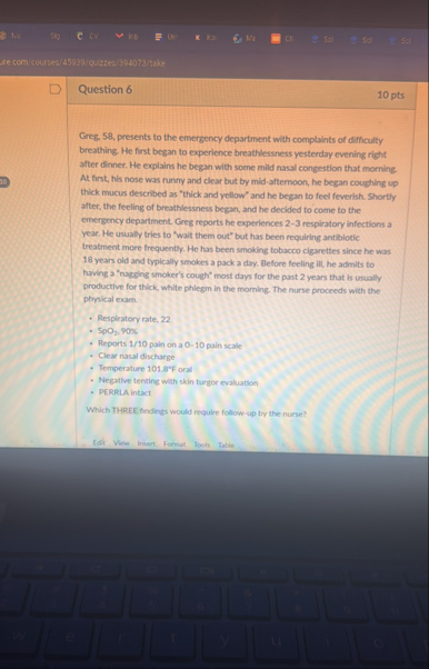 Greg. 58, presents to the emergency department with complaints of difficulty breathing. He first began to experience breathlessness yesterday evening right after driner. He explains he began with some mild nasal congestion that morning. At frst, his nose was runny and clear but by mid-afternoon, he began coughing up thick mucus described as "thick and yellow" and he began to feel feverish. Shortly after, the feeling of breathlessness began, and he decided to come to the emergency department. Greg reports he experiences
