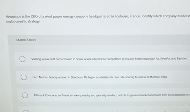 Veronique is the CEO of a wind power energy company headquartered in Toulouse. France. Identify which company model st multidomestic strategy.