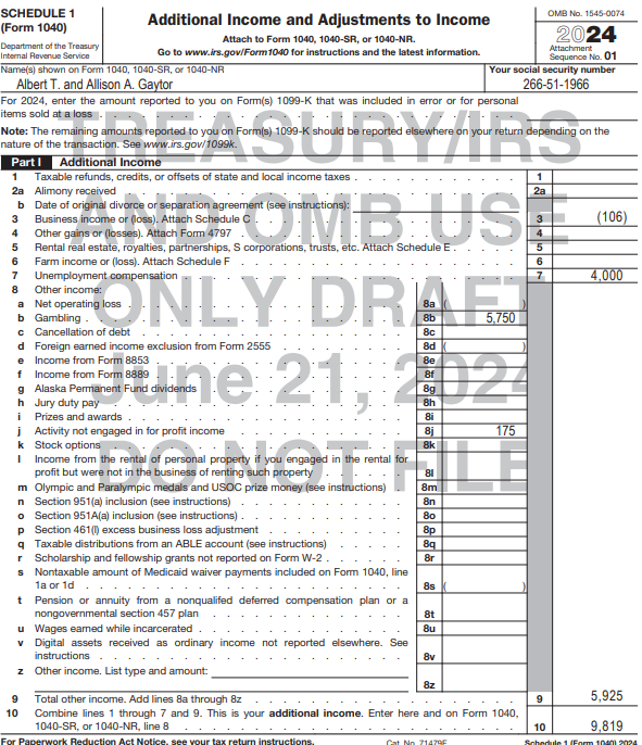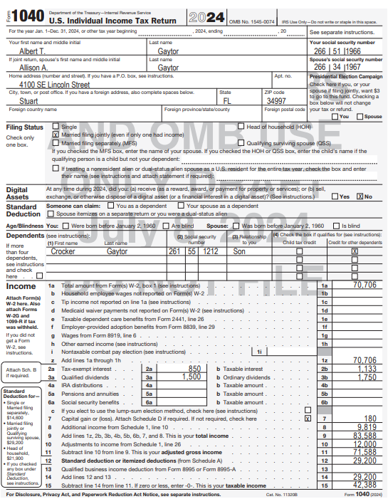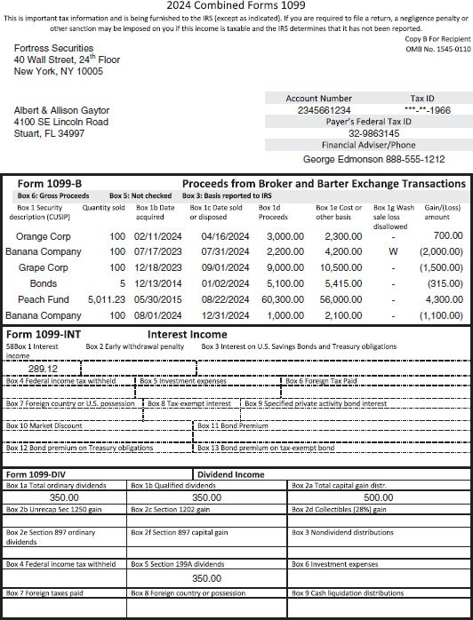 The Gaytors own a rental beach house in Hawaii. It was rented for the full year during 2024 and was not used by the Gaytors during the year. The Gaytors were active participants in the management of the rental house but the activity is not eligible for a QBI deduction. Pertinent information about the rental house is as follows: Address: 1237 Pineapple St., Lihue, HI 96766. Gross rental income: 21,000. Mortgage Interest: 9,100. Real estate taxes: 2,800. Utilities: 1,500. Cleaning: 2,600. Repairs: 600. The house is fully depreciated so there is no depreciation expense. Albert and Allison received the following combined statements from their investment manager(See attachment). The Gators sold 100 shares of Banana Company on July 31, 2024 and the following day purchased 100 shares at a cost of $2,100. They Gaytors held no shares of Banana Company at year end. On January 12, 2024, Albert and Allison sold their personal residence and purchased a new house for $725,000. Selling costs totaled $54,000. The house they sold was their personal residence before and after the divorce (they have lived in it together for three years since remarrying). The sold house cost $120,200 back in January of 2011 and the Gaytors added on a new bedroom and bathroom a few years ago for a cost $20,300. They also built a pool for a cost of $61,400. They moved into their new horse on January 19, 2024. TASK: With this information, edit and add to the 2024 task return for Albert and Allison.