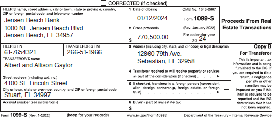 \hline Banana Company & 100 & 08/01/2024 & 12/ FILER'S name, street address, city or town, state or province, country, ZIP or foreign postal code, and telephene numberFor calengar year \( 20 \underline{24} \)3 Address (ncluding city, state, and ZIP code) or legal description