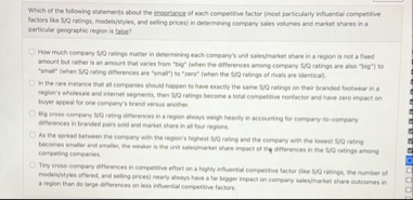 Which of the following statements about the imeortance of each competitive factor (most particularly influential competitive factors lae S/9 ratings, modely/utyles, and selling pricei) in determining company sales volumes and market shares in a particular geographic region is false?