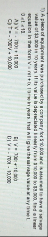 (Solved): A piece of equipment was purchased by a company for $10,000 ...