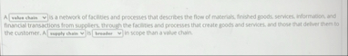 is a network of factilies and processes that describes the flow of muterials, finehed goods, services. informaton, and fir incult tran actions from suppliers. through the factities and processes that create goods and senvies, and those that delver them to the customer. A