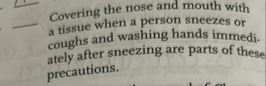 Covering the nose and mouth with a tissue when a person sneezes or coughs and washing hands immediately after sneezing are parts of these precautions.