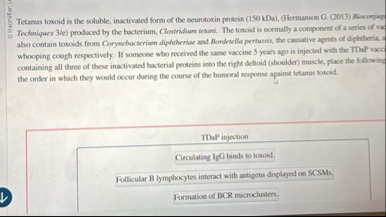 (3)/(e) ) produced by the bacterium, Clostridium telaxi. The toncid is normally a component of a series of val whooping cough respectively. If someone who received the same vaccine 5 years ago is injected with the TDaP vacc containing all three of these inactivated bacterial proteins into the right delloid (shoulder) muscle, place the following the order in which they would occur during the course of the humoeal response apainst tetanus towid.