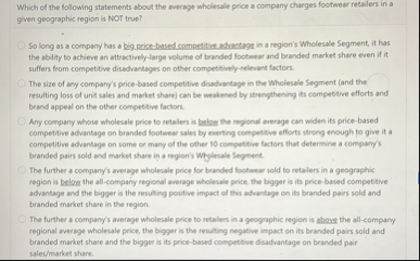 Which of the following statements about the average wholesale price a company charges footwear retailers in a given geographic region is NOT true?