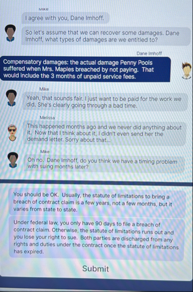 Compensatory damages: the actual damage Penny Pools suffered when Mrs. Maples breached by not paying. That would include the 3 months of unpaid service fees.