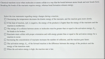 Chemical reactions occur when molecules er actiens cellide is a wey that the besth betwees awoms bruk and new bonds form. Bualing the houds of the reacturs moques energy, wheran held frective meres every