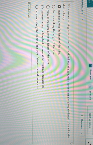 If a current-carrying wire has a cross-sectional area that gradually becomes smaller along the length of the wire, the drift velocity
