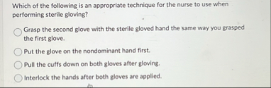 Which of the following is an appropriate technique for the nurse to use when performing sterile gloving?