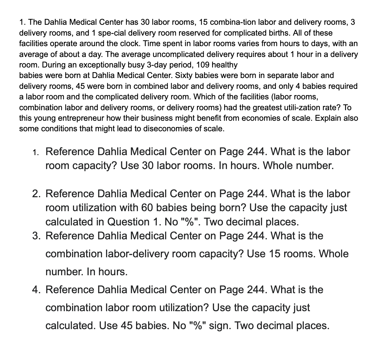 1. The Dahlia Medical Center has 30 labor rooms, 15 combina-tion labor and delivery rooms, 3 delivery rooms, and 1 spe-cial delivery room reserved for complicated births. All of these facilities operate around the clock. Time spent in labor rooms varies from hours to days, with an average of about a day. The average uncomplicated delivery requires about 1 hour in a delivery room. During an exceptionally busy 3-day period, 109 healthy babies were born at Dahlia Medical Center. Sixty babies were born in separate labor and delivery rooms, 45 were born in combined labor and delivery rooms, and only 4 babies required a labor room and the complicated delivery room. Which of the facilities (labor rooms, combination labor and delivery rooms, or delivery rooms) had the greatest utili-zation rate? To this young entrepreneur how their business might benefit from economies of scale. Explain also some conditions that might lead to diseconomies of scale. 1. Reference Dahlia Medical Center on Page 244. What is the labor room capacity? Use 30 labor rooms. In hours. Whole number. 2. Reference Dahlia Medical Center on Page 244. What is the labor room utilization with 60 babies being born? Use the capacity just calculated in Question 1. No "\%". Two decimal places. 3. Reference Dahlia Medical Center on Page 244. What is the combination labor-delivery room capacity? Use 15 rooms. Whole number. In hours. 4. Reference Dahlia Medical Center on Page 244. What is the combination labor room utilization? Use the capacity just calculated. Use 45 babies. No "\%" sign. Two decimal places.