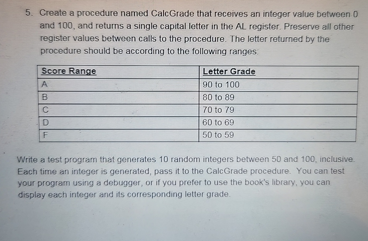 Write a test program that generates 10 random integers between 50 and 100, inclusive. Each time an integer is generated, pass it to the CalcGrade procedure. You can test your program using a debugger, or if you prefer to use the book's library, you can display each integer and its corresponding letter grade.