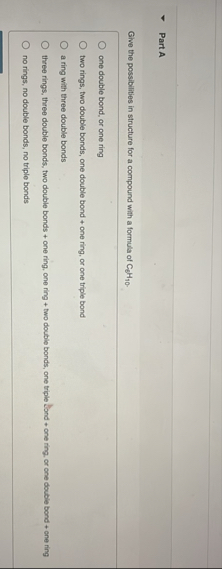◻ three rings, three double bonds, two double bonds one ring, one ring two double bonds, one triple Lond one ring, or one double bond one ring