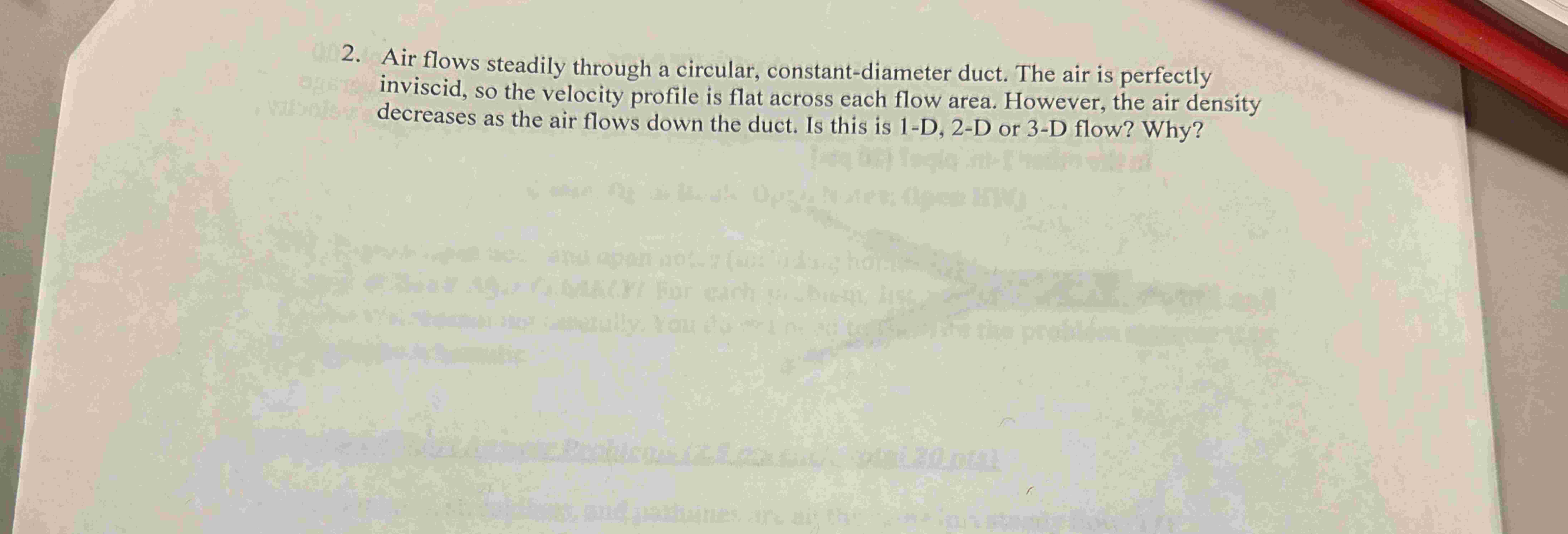 2. Air flows steadily through a circular, constant-diameter duct. The air is perfectly inviscid, so the velocity profile is flat across each flow area. However, the air density decreases as the air flows down the duct. Is this is 1-D, 2-D or 3-D flow? Why?