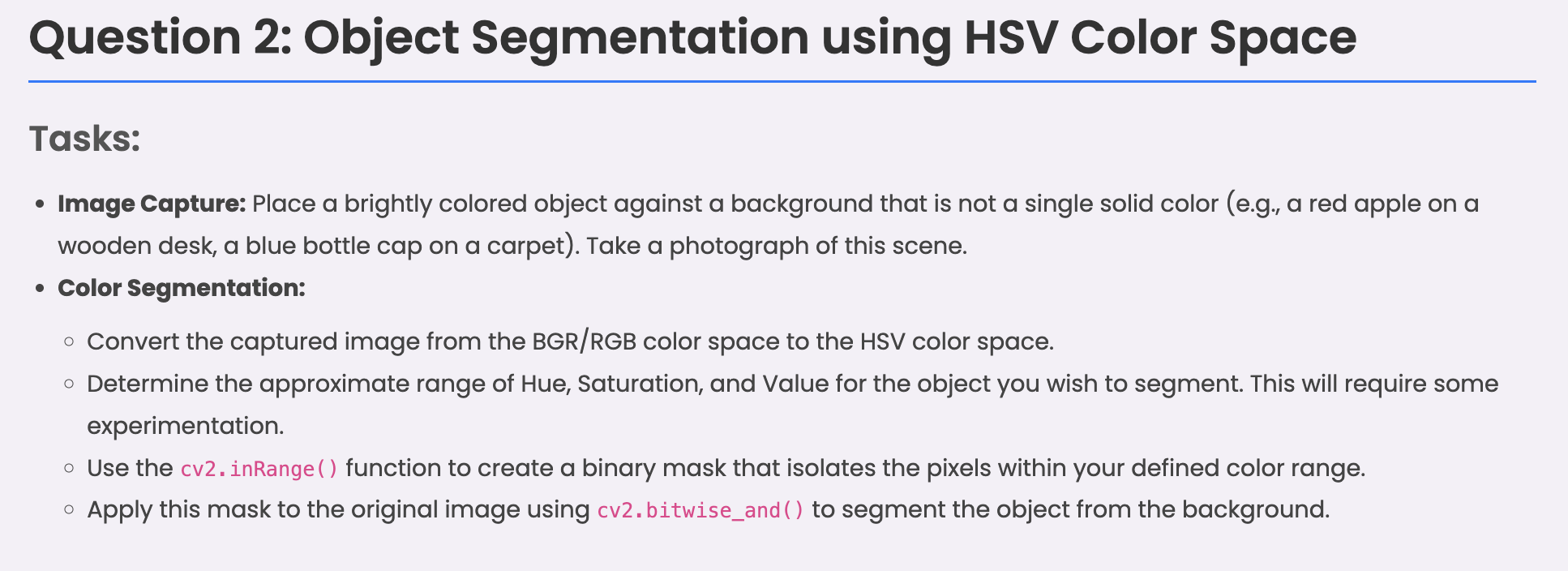 Tasks: - Image Capture: Place a brightly colored object against a background that is not a single solid color (e.g., a red apple on a wooden desk, a blue bottle cap on a carpet). Take a photograph of this scene. - Color Segmentation: - Convert the captured image from the BGR/RGB color space to the HSV color space. - Determine the approximate range of Hue, Saturation, and Value for the object you wish to segment. This will require some experimentation. - Use the cv2. inRange ( ) function to create a binary mask that isolates the pixels within your defined color range. - Apply this mask to the original image using cv2. bitwise_and ( ) to segment the object from the background.