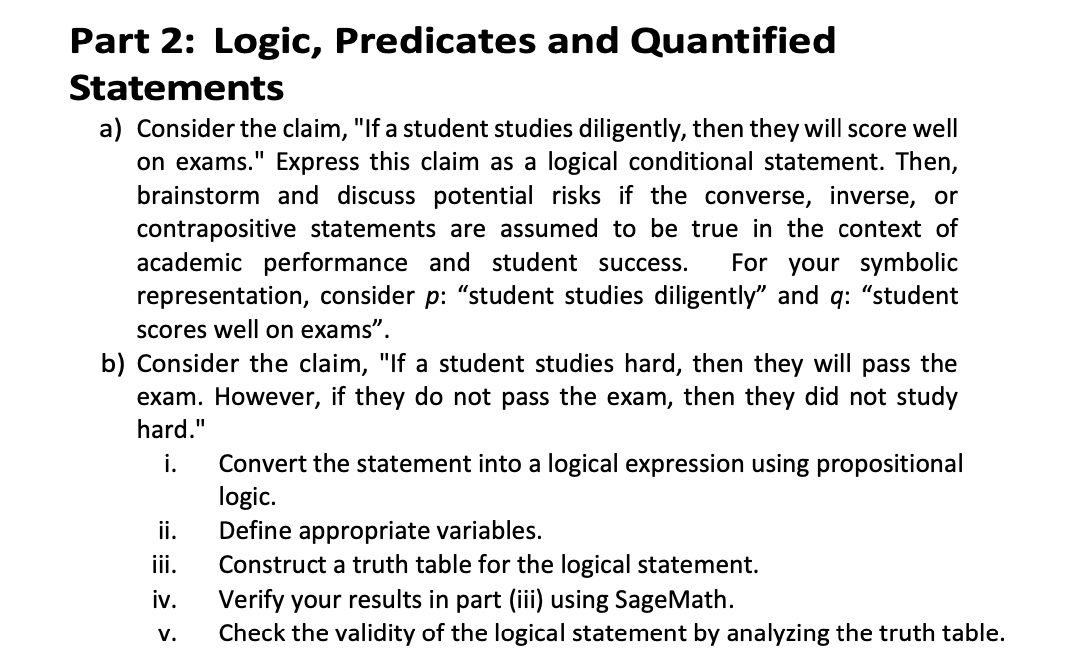 Part 2: Logic, Predicates and Quantified Statements a) Consider the claim, "If a student studies diligently, then they will score well on exams." Express this claim as a logical conditional statement. Then, brainstorm and discuss potential risks if the converse, inverse, or contrapositive statements are assumed to be true in the context of academic performance and student success. For your symbolic representation, consider p : "student studies diligently" and q : "student scores well on exams". b) Consider the claim, "If a student studies hard, then they will pass the exam. However, if they do not pass the exam, then they did not study hard." i. Convert the statement into a logical expression using propositional logic. ii. Define appropriate variables. iii. Construct a truth table for the logical statement. iv. Verify your results in part (iii) using SageMath. (SageMath coding must be used ) v. Check the validity of the logical statement by analyzing the truth table.