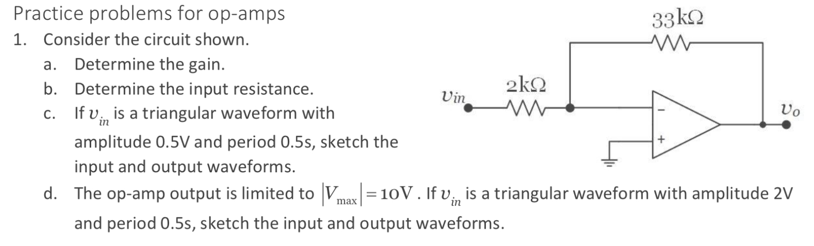 Practice problems for op-amps Consider the circuit shown. a. Determine the gain. b. Determine the input resistance. c. If
