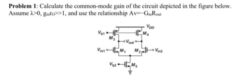 Problem 1: Calculate the common-mode gain of the circuit depicted in the figure below. Assume