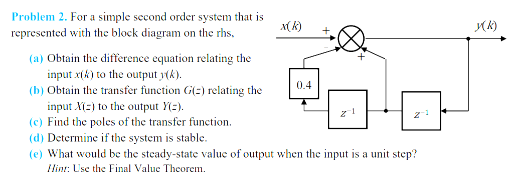 Problem 2. For a simple second order system that is represented with the block diagram on the rhs, (a) Obtain the difference equation relating the input \( x(k) \) to the output \( y(k) \). (b) Obtain the transfer function \( G(z) \) relating the input \( X(z) \) to the output \( Y(z) \). (c) Find the poles of the transfer function. (d) Determine if the system is stable. (e) What would be the steady-state value of output when the input is a unit step? Hint: Use the Final Value Theorem.