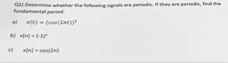 Q1) Determine whether the following signals are periodic. If they are periodic, find the fundamental period. a)