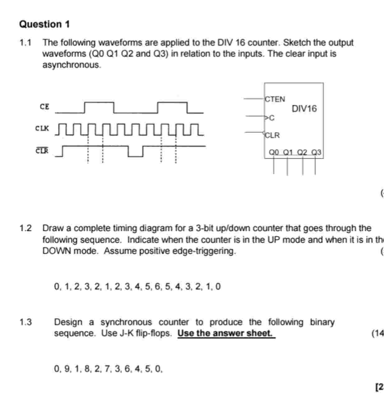 1.1 The following waveforms are applied to the DIV 16 counter. Sketch the output