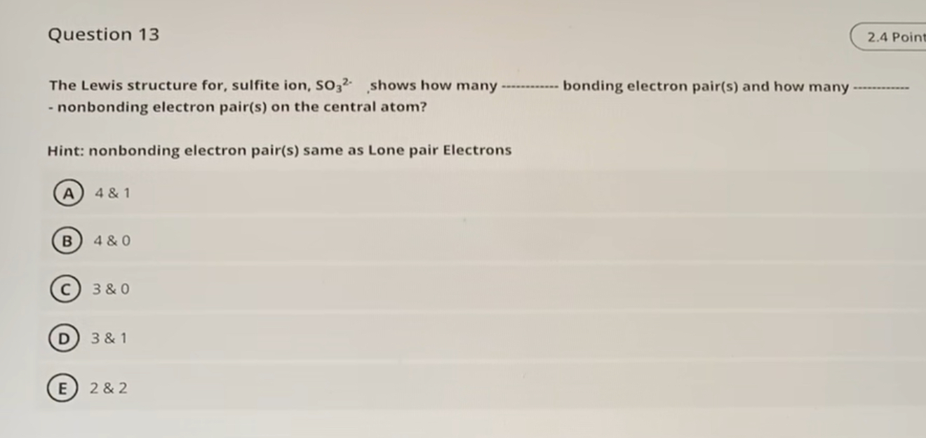 Question 13 The Lewis structure for, sulfite ion, \( \mathrm{SO}_{3}{ }^{2-} \), shows how many bonding electron pair(s) and how many - nonbonding electron pair(s) on the central atom? Hint: nonbonding electron pair(s) same as Lone pair Electrons4 \& 14 \& 03 \& 03 \& 12 \& 2
