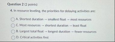 Question 2 (2 points) 4. In resource leveling, the priorities for delaying activities are: