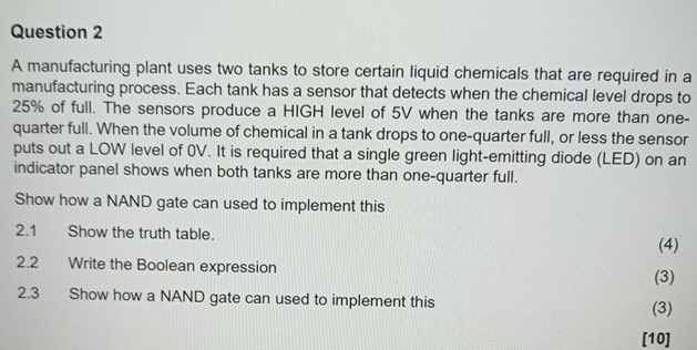 25%of full. The sensors produce a HIGH level of 5 V when the tanks are more than onequarter full. When the volume of chemical in a tank drops to one-quarter full, or less the sensor puts out a LOW level of 0 V . It is required that a single green light-emitting diode (LED) on an indicator panel shows when both tanks are more than one-quarter full. Show how a NAND gate can used to implement this 2.1 Show the truth table. (4) 2.2 Write the Boolean expression (3) 2.3 Show how a NAND gate can used to implement this (3) [10]