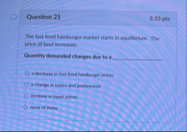 Question 21 3.33 pts The fast food hamburger market starts in equilibrium. The price of beef increases. Quantity demanded changes due to a