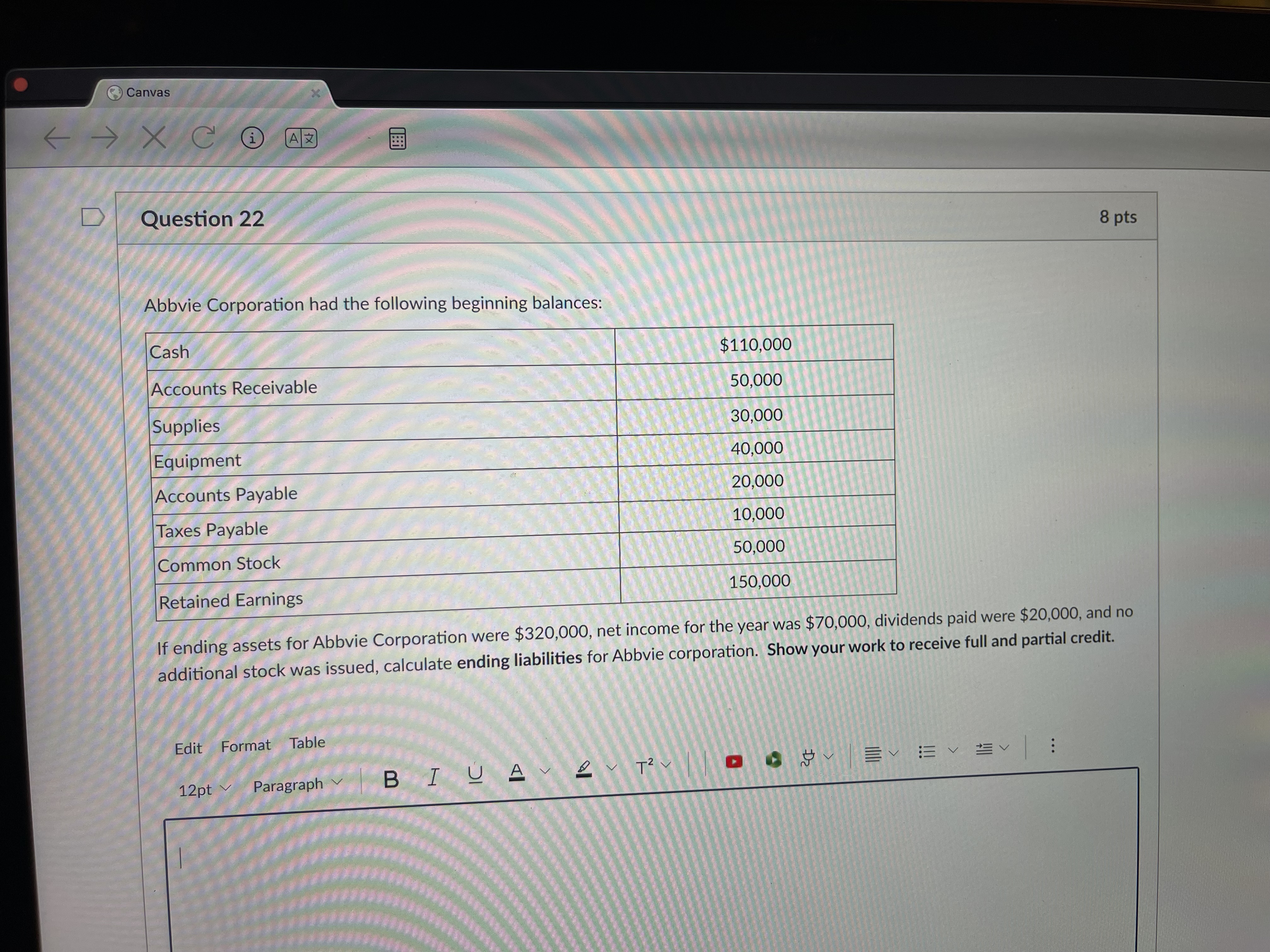 If ending assets for Abbvie Corporation were $320,000, net income for the year was $70,000, dividends paid were $20,000, and no