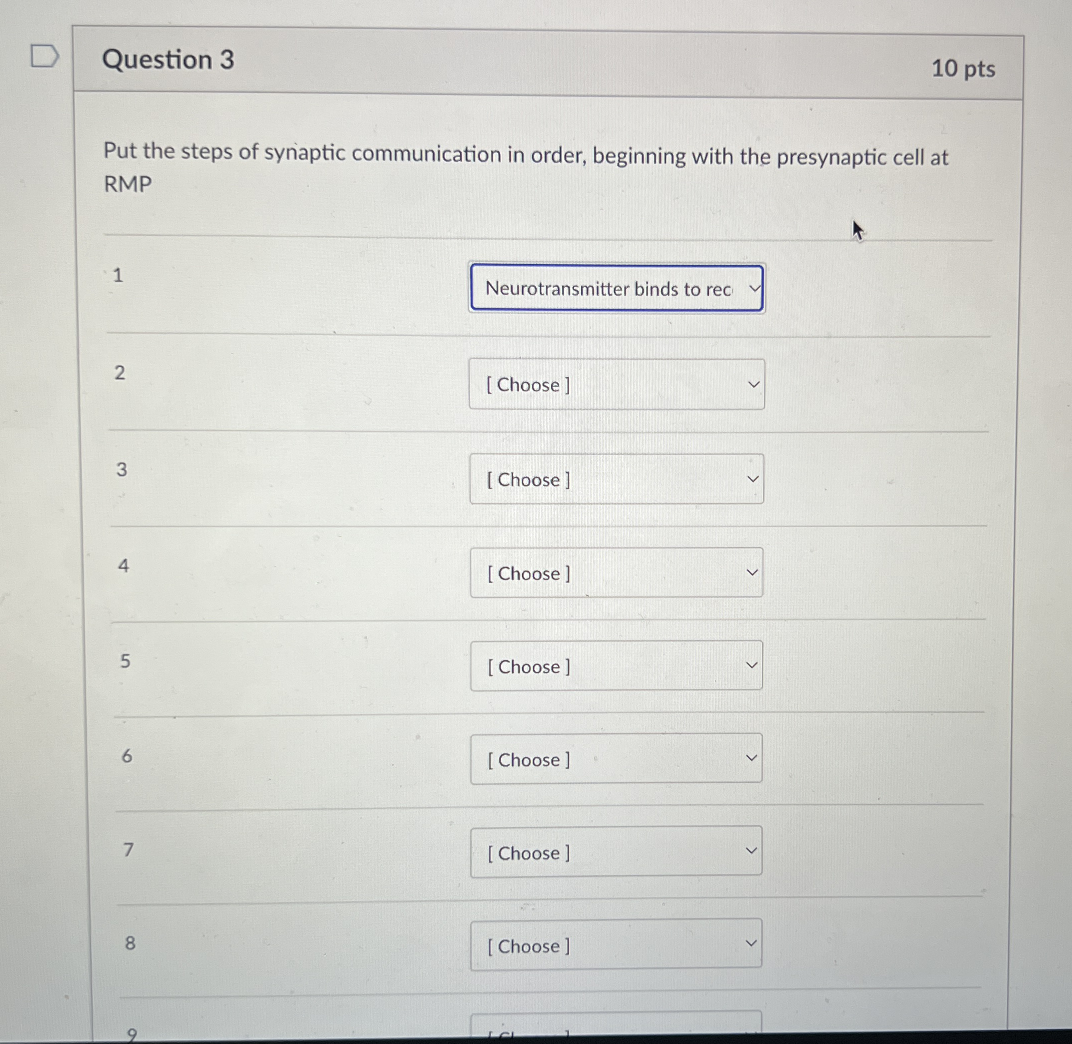 Question 3 10 pts Put the steps of synaptic communication in order, beginning with the presynaptic cell at RMP 1