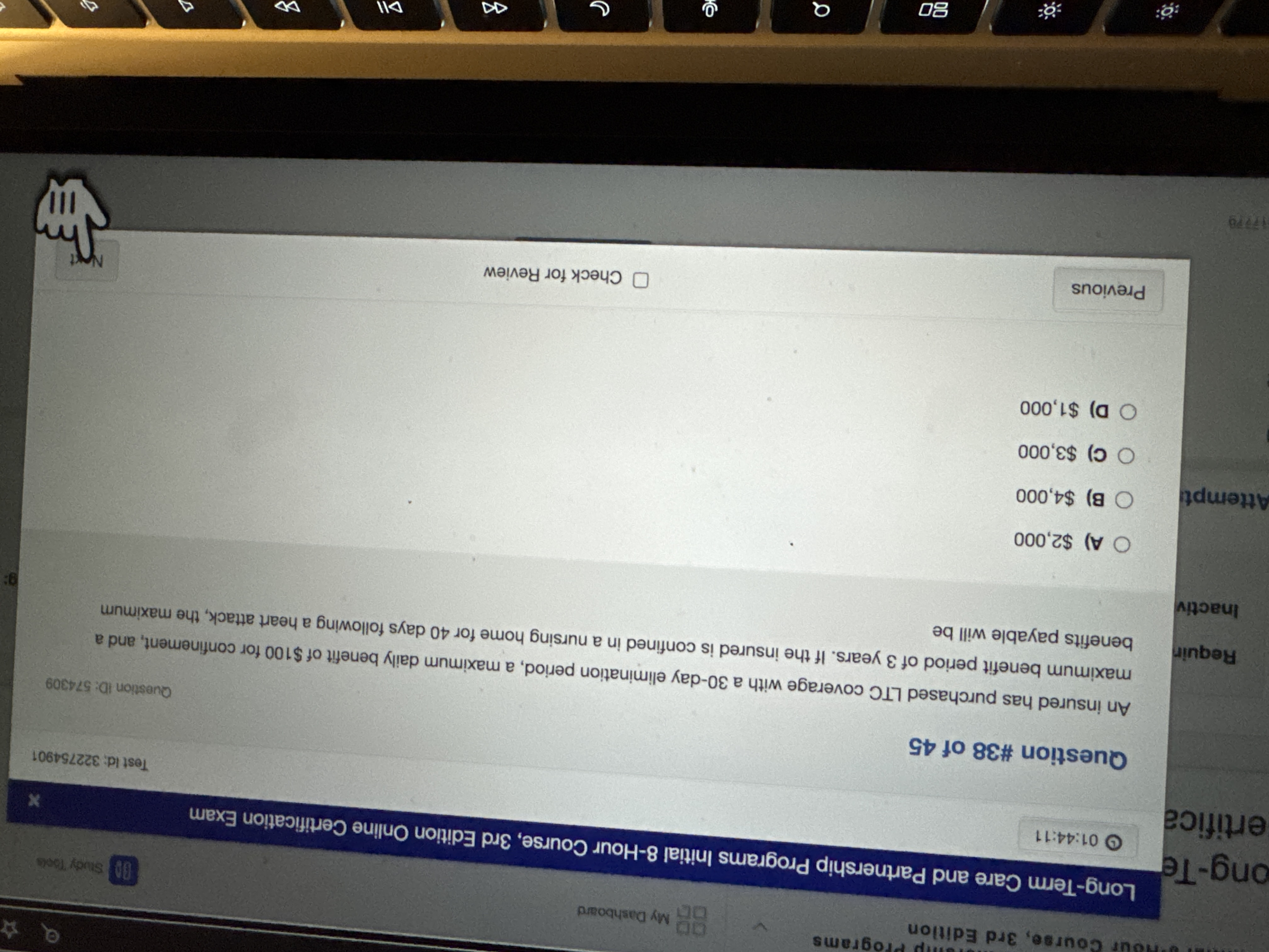 An insured has purchased LTC coverage with a 30-day elimination period, a maximum daily benefit of $100 for confinement, and a