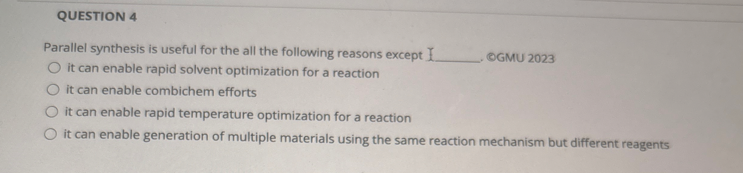 QUESTION 4 Parallel synthesis is useful for the all the following reasons except it can enable rapid solvent optimization for a reaction